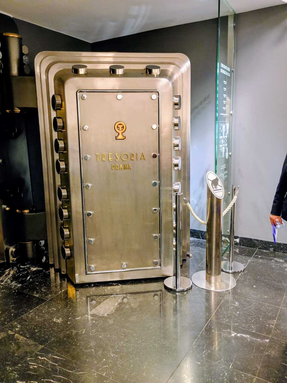V České národní bance nás čekal program „Lidé a peníze“. Kvůli většímu počtu jsme se rozdělili do dvou skupin, které postupně absolvovaly výklad o historii českých mincí a bankovek, prohlídku trezoru a také interaktivní, vizuálně poutavý film o Aloisi Rašínovi. Největší úspěch mělo bezpochyby potěžkání zlaté cihly – málokdo čekal, jak je zlato ve skutečnosti těžké. Prohlídka byla velmi zajímavá a mnozí by jistě ocenili více času na dotazy.