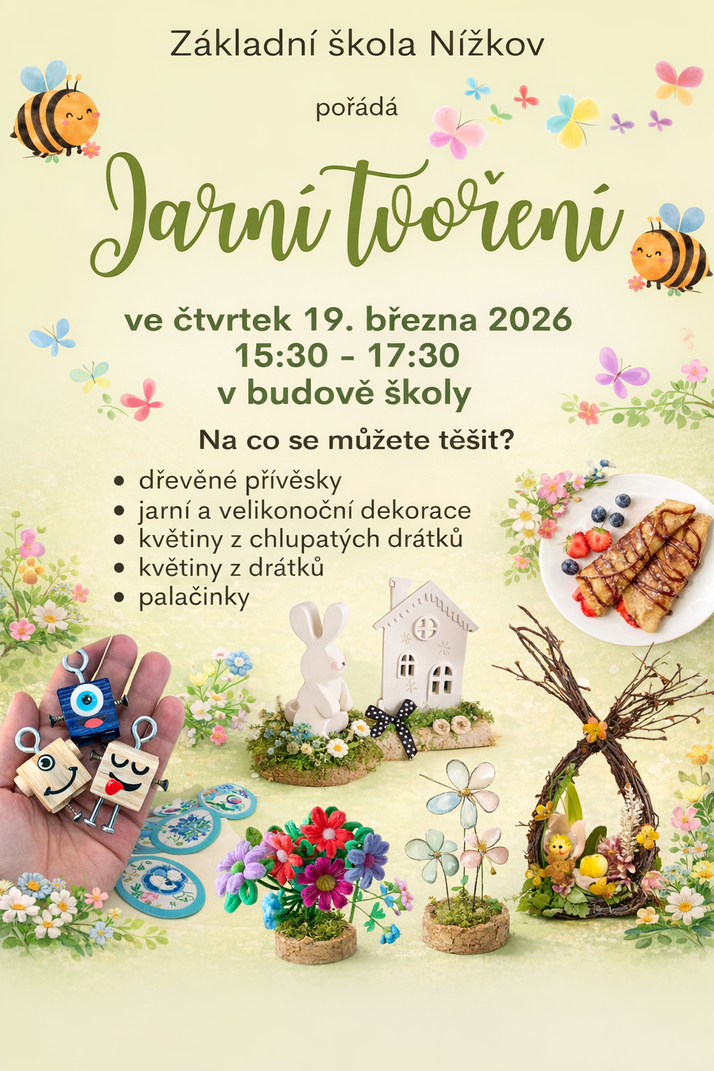 Základní škola Nížkov srdečně zve děti, rodiče i širokou veřejnost na Jarní tvoření, které se uskuteční ve čtvrtek 19. března 2026 od 15:30 do 17:30 v budově školy.