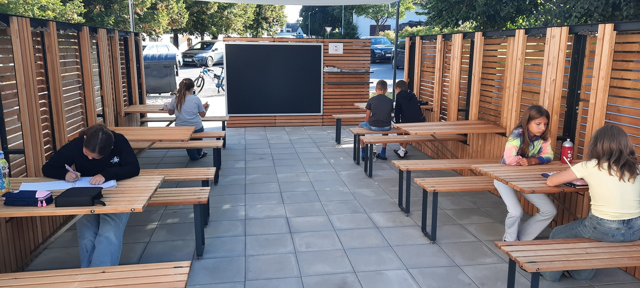 - Vedle školy je zahrada s venkovní učebnou a zařízením určeným k relaxaci.